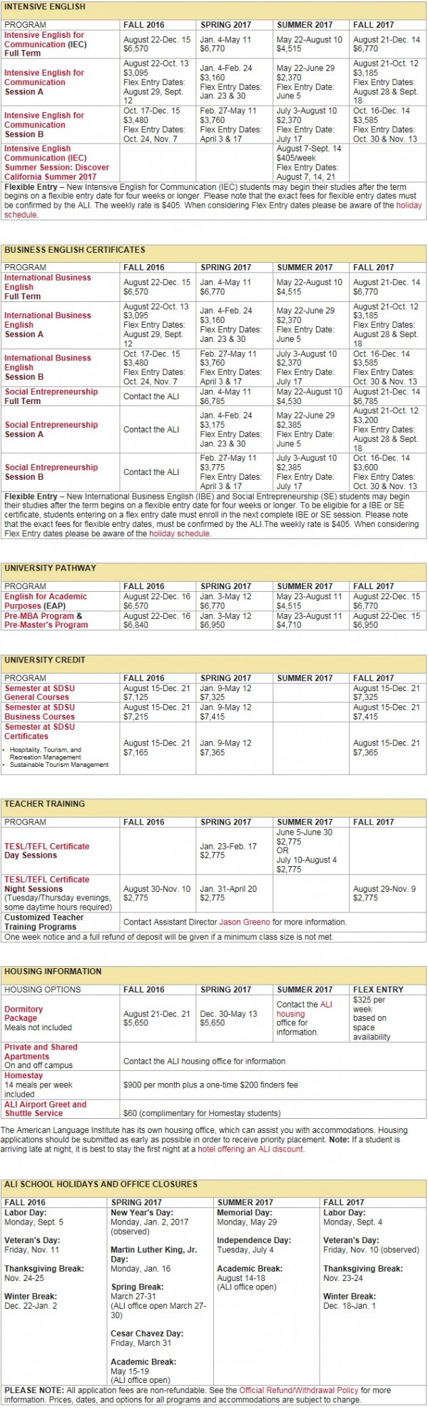 | 학비 | ALI Calendar & Fees